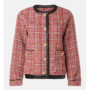 English Factory Pink Tweed Blazer LARGE Boxy Boucle Faux Leather Clueless $210