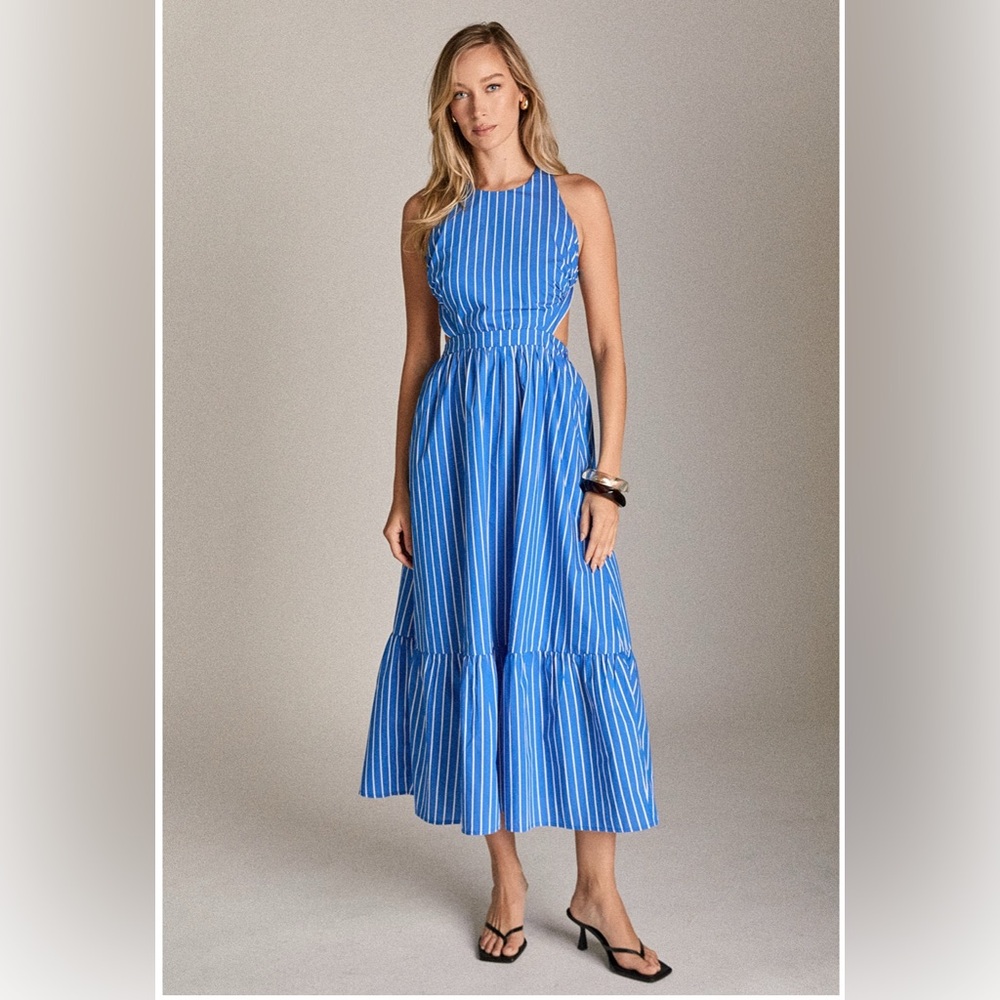 sleeveless dress features a round neckline and a flattering open-back design with elasticized bands for a flexible, comfortable fit.
