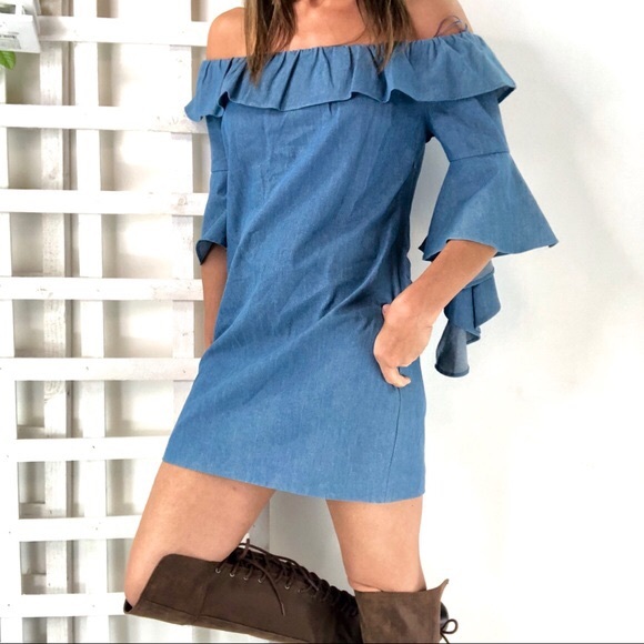 Cute denim like, ruffle sleeve dress that would look great with tan suede low heel boots or fringed boots.