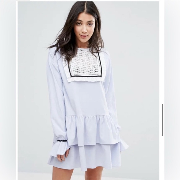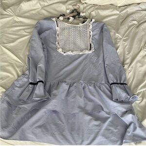 Chic light blue dress with long sleeves. Features ruffle accents and lace detail. Perfect for stylish outings.