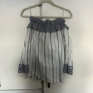 Super cute! Stylish off-shoulder blouse with ruffle detail. Blue and white stripes add a classic touch.