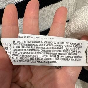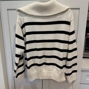 100% cotton mid-weight knit cream/black striped sweater. Collard neck with 1/2 zip. Long sleeve with drop shoulder.