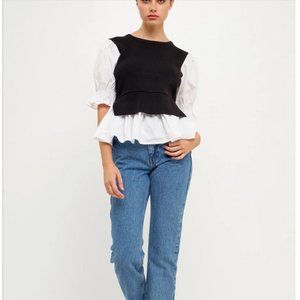 Keep your wardrobe simple and comfortable with the English Factory Sweater Poplin Mixed Top. This versatile top can be dressed up or down and will look good with any bottom. Wear this sweater poplin mixed top with a skirt or skinny jeans and heels for a fashionable day-to-night look.