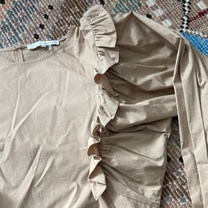Chic tan blouse with ruffle details. Long sleeves and puffy shoulders. Stylish and versatile. Only worn once.