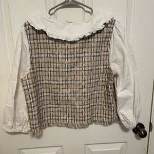 3/4 quarter sleeve with a Peter Pan collar. Worn a couple times and is in great condition.