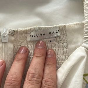 Beautiful top. Small stains that would probably come out at dry cleaners or spot remover. (Highly discounted). Beautiful details -floral stitching. Can’t notice stains when wearing. Upper left breast and bottom of front have stains (photo included)