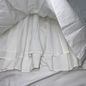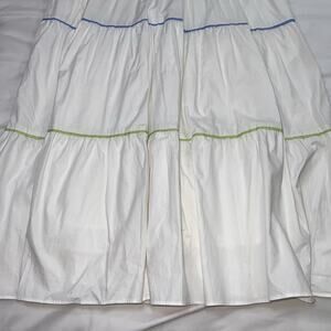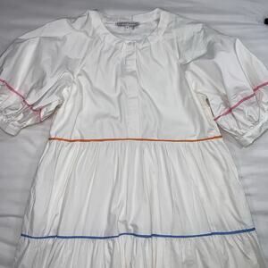Chic white dress with colorful stripe accents. Features puff sleeves and tiered design. Perfect for casual outings.