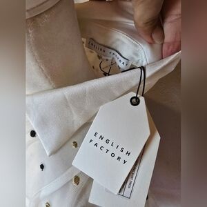This stunning white dress by English Factory features a notched collar and bishop sleeves, perfect for a wedding guest. The ruffled, tiered design adds a touch of elegance, while the lightweight fabric ensures comfort and style.