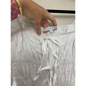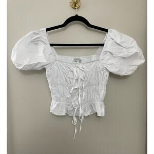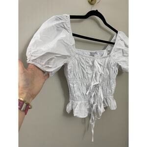 English Factory Women's Tie Detail Shirring Top with Short Sleeves XS, MSRP $70. "Looking for something different in a top? Check out our tie detail shirring top with short sleeves. This top has everything you need to make a statement. Whether you're dressing up for a special occasion or just want to add a little flair to your everyday look, this top is a great choice." 100% cotton, P2P 15-18 inches ( stretches due to smocking) length 16.5 inches. Excellent used condition, no flaws noted. Please don't hesitate to ask any further questions. Smoke free pet friendly home. Check out my other listings for a bundle deal!