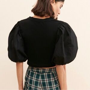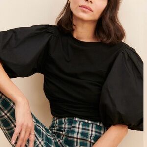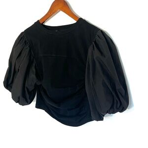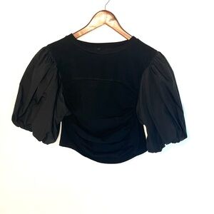 English Factory black exaggerated puff sleeve top blouse with ruching, cotton Medium. Underarm to Underarm measurement laid flat is approximately 14”. Underarm to bottom is approximately 6”. No rips, stains, or holes
