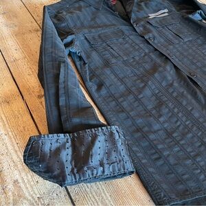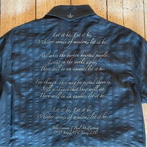 Beautifully made black embroidered shirt. Features the John Lennon and Paul McCartney song, "Let It Be" lyrics on back. Three button cuffs with black dot fabric detail lining. Can be worn up or down. Fantastic detail on this unique shirt.