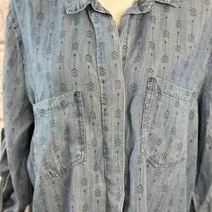 Soft 100% Tencel material with a subtle arrow print, chest pockets, and roll-tab sleeves. Lightweight and breathable – perfect for layering or wearing on its own.