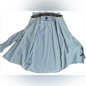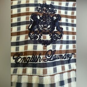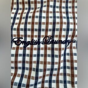 Classic and bold, this English Laundry men’s dress shirt features a brown and navy windowpane check pattern with embroidered branding and contrast lining inside the cuffs and collar. 100% cotton, button-front, and tailored for a modern, slightly slim silhouette. Size 16 neck / 36–37 sleeve. Gently worn with no visible flaws—ready for your next polished outfit.