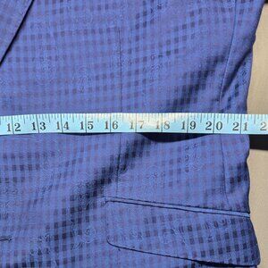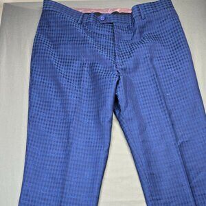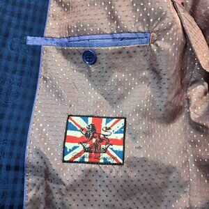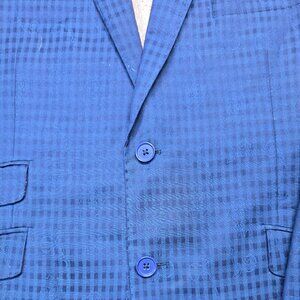Stylish and modern English Laundry men’s suit featuring a rich royal blue tone with a subtle textured check pattern. The blazer includes a distinctive pink interior lining, flap pockets, and classic button closure, offering a bold yet elegant look suitable for business, events, weddings, or special occasions.