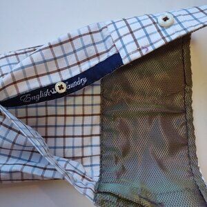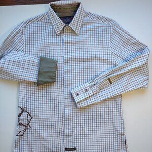 Shirt is Cream with Blue & Brown stripes/checks