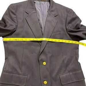 The blazer is a size 41 and has a chest size of 42 inches. The jacket/coat length is regular, and the material is wool. The blazer is a classic piece that is perfect for those who appreciate English academia and classic styles.