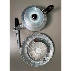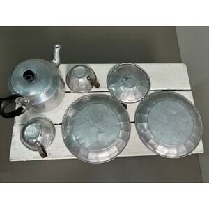 For sale is a charming vintage midcentury 7-piece aluminum tea set, perfect for play or display. This eclectic lot includes a standout teapot marked “JJ95 Teapot 6-1544” by N C Joseph Ltd, Stratford-on-Avon, England. Crafted from quality hammered aluminum, the 4” round, 3” tall teapot features a classic Bakelite handle and lid, adding to its midcentury appeal. The base of the handle shows some scorching (see photos), and there are minor scuffs consistent with age and use, but the piece remains structurally sound with no loose or broken parts.