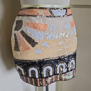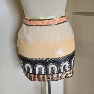 Fully sequined mini skirt with colosseum/sunburst pattern on front. Colosseum pattern on back, side zip, fully lined.