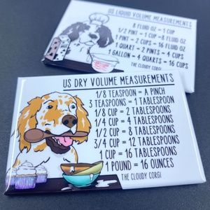 This handmade magnet set features hand illustrated dogs with handy conversion charts you can reference while cooking or baking!
