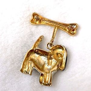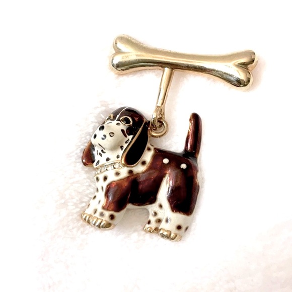 English Spaniel dog and bone costume jewelry brooch/pin. Brown and white enamel. Good condition.