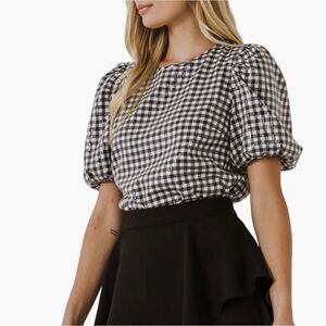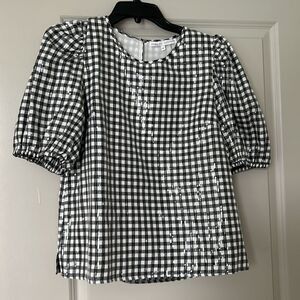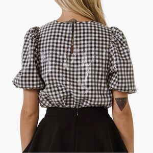 Lustrous sequins and an allover gingham print bring visual interest to a boxy top framed by short puff sleeves.