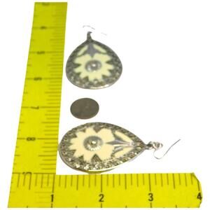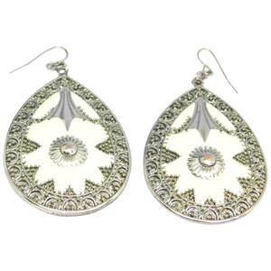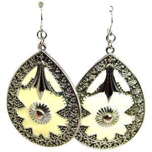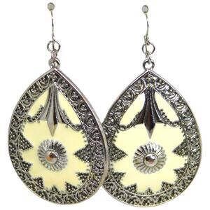 Engraved Mandala Design Earrings Pierced Silver & Cream Color Tone Statement 2"