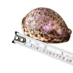 Beautifully engraved seashell featuring the design '100 Islands, Philippines'. It showcases a blend of purple and brown colors.