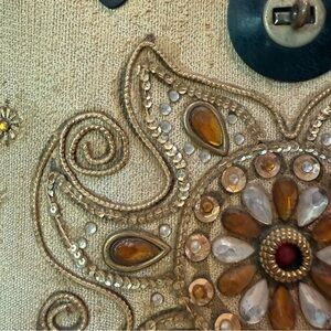 This is not in the best condition. It’s needs some cleaning and sequins and jewels are missing, but there are no rips or holes. The leather and wood is good. It can be fixed up. This is why I’m selling it cheap.