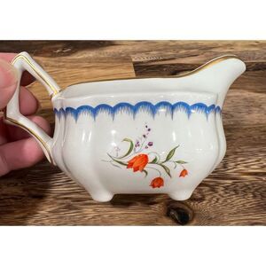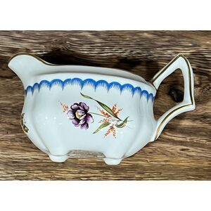 Beautiful vintage creamer and sugar set by Enoch Wedgwood (Tunstall) Ltd, in the “Lowestoft” pattern. Features hand-painted multicolor florals, cobalt blue scalloped trim, and gold gilt accents. Made in England.