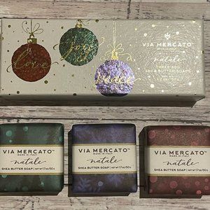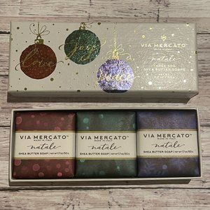 A pack consists of three shea butter enriched soaps. Carefully crafted in Italy with shea butter, glycerin, Italian olive oil and coconut oil, placed in a beautiful gift box. Use all three varieties of the via Mercato mini candle-love, peace and joy-to influence the mood in your home throughout the holiday season. Made in Italy.