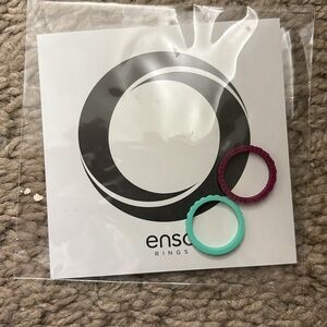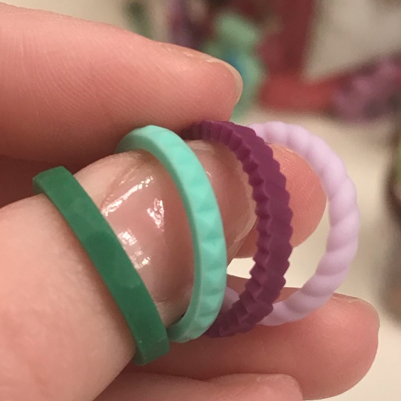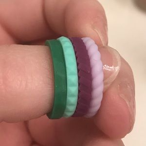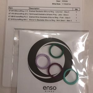Enso silicone rings NWT, all size 5. 4 colors/patterns. Purple-jaded blocks,light purple-braided,green-dented,mint-ridged. Can be worn separate or together. I am a size 4.5,they fit perfect. Perfect for everyday, can be left on when washing 🖐🏻.