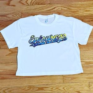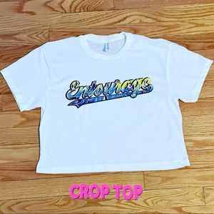This crop has a modest cut and a length that hits just below the belly button. www.theentourageclothing.com