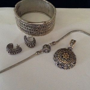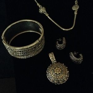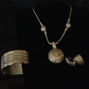 Original prices: bracelet $55 earrings $36 necklace $98 Enhancer $45. Beautiful set. Enhancer can be removed to wear necklace alone. Silver tone and gold tone. Please no lowball offers.