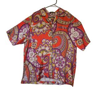 Entro 60s Inspired Groovy Floral Paisley Red Button-Up Short-Sleeve Shirt Sz L