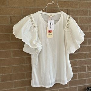 Elevate your style with the Lee White Ruffle Sleeve Top. Featuring elegant ruffle sleeves and a classic white hue, this top is perfect for any occasion.