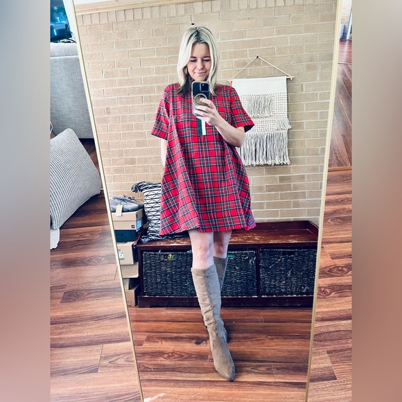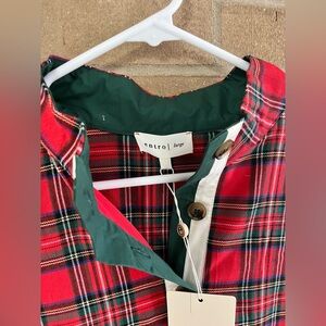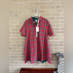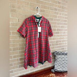 Bright red plaid dress with short sleeves. Contrasting green placket and neckline trim. Button-front detail at the chest. Casual, easy-to-wear silhouette for everyday activities.