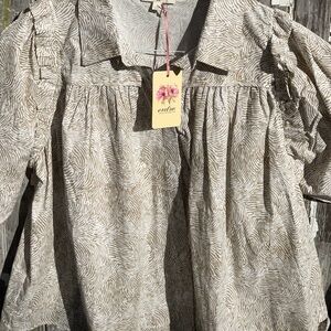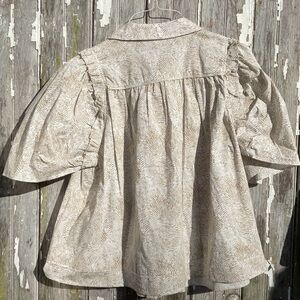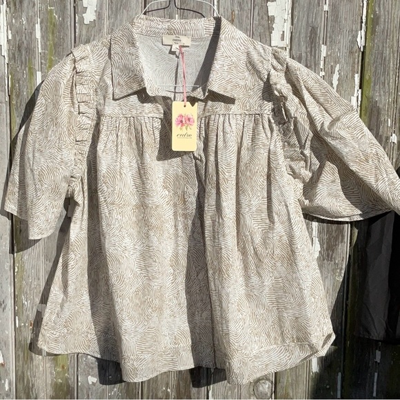 Stylish beige blouse with a unique pattern. Features a classic collar and short sleeves.