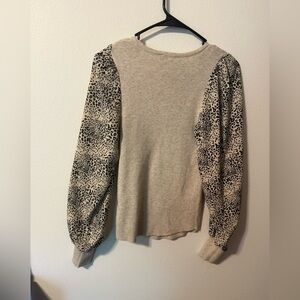 Tags: Animal Print Sleeves, V-Neck Sweater, Stylish Layers, Patterned Sleeves, Trendy Tops, Chic Fashion, Neutral Sweaters, Fall Fashion, Statement Sleeves, Unique Style