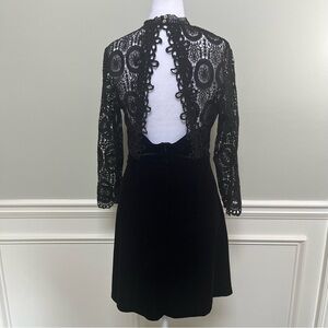 Chic black lace dress with long sleeves. Features intricate lace patterns. Perfect for elegant occasions.