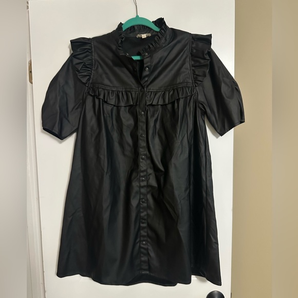 Chic black dress with ruffled details. Button-down front. Short sleeves. Perfect for any occasion.