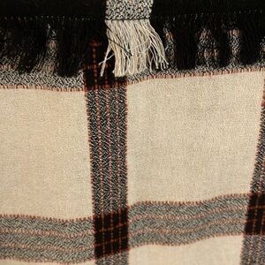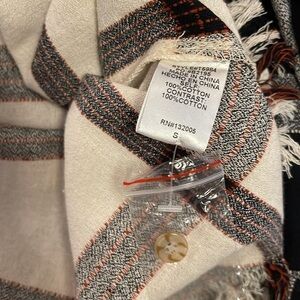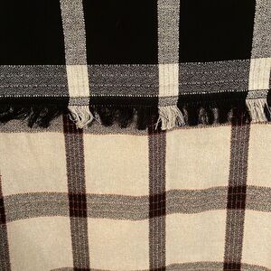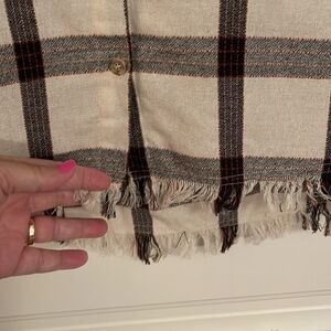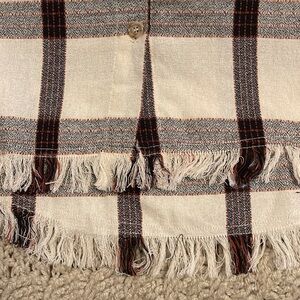 Stylish plaid button down. Features black and white checkered pattern. Frayed hem for a trendy look. Perfect for casual wear.