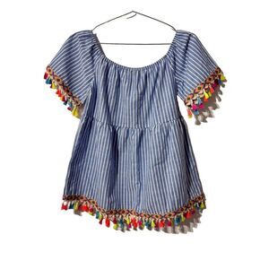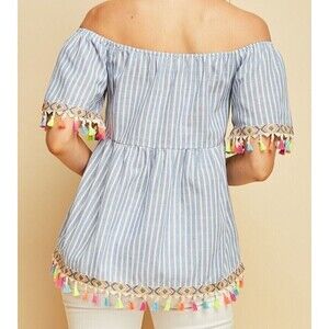 Entro Blouse Top M Blue-White Haidee Pinstripe Tassel Detail Off The Shoulder