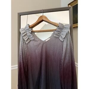 Turn heads in this stunning Entro ombre blouse featuring a soft gradient from purple to gray with a subtle glitter shimmer. Feminine ruffle details at the shoulders add the perfect touch of glam, while the lightweight flowy fabric makes it flattering and comfortable. Perfect for date night, parties, or holiday gatherings.