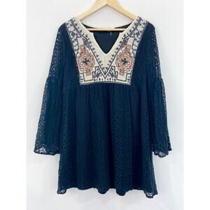 Entro Boho Black Lace Embroidered Tunic Top sz Large Bohemian Indie Bell Sleeve