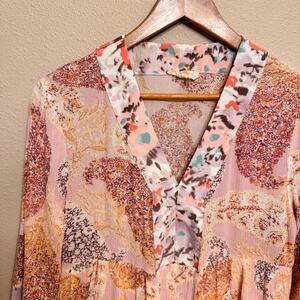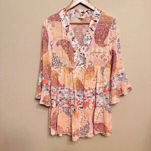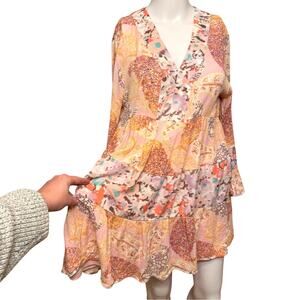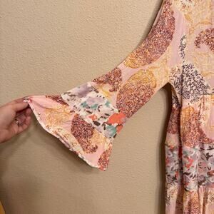 Entro Boho Floral Patchwork Mini Dress Size M Bell Sleeve Tiered Ruffle Cottage