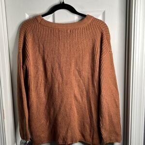 Brown chunky knit. Tie up the front with gold grommets. Low v neckline. This will be great for a casual weekend look with jeans or for work for a dressier look. Super versatile sweater.