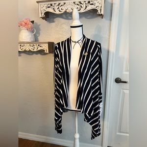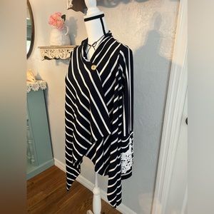 Entro cardigan size small. Navy Blue with white stripes. Has one button at the top for closures or wear open. Lace on sleeves. New without tags.