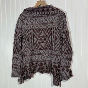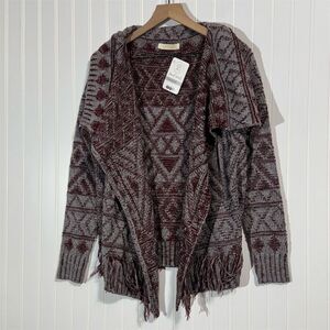 Entro Cardigan Sweater M Maroon Gray Tribal Fringe Hem Open Front NWT Western
