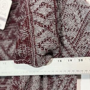 Brand new with tags Entro women’s cardigan sweater featuring a maroon and gray tribal-inspired knit pattern, open front design, and fringe hem detailing. Crafted from soft acrylic, this medium-weight cardigan is perfect for layering and adding a touch of boho flair to your outfit.