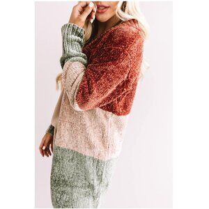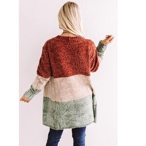 Stay cozy in style with this brand new Entro chenille cardigan. This women's size small cardigan features a trendy color block design in rich hues of burgundy, blush pink, and sage green. Made from 100% polyester, the super soft chenille knit offers comfort and warmth for cool weather layering.